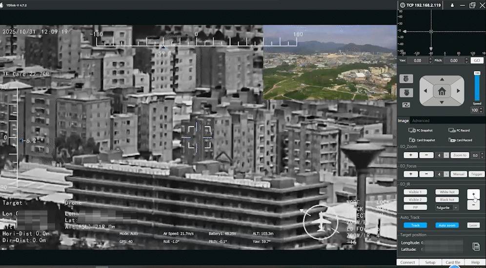 The pilot can use the LAUNCH GCS to monitor the target's movement status, such as real-time updated GPS coordinates, the distance between the target and the drone, as well as the distance between the target and the HOME position.