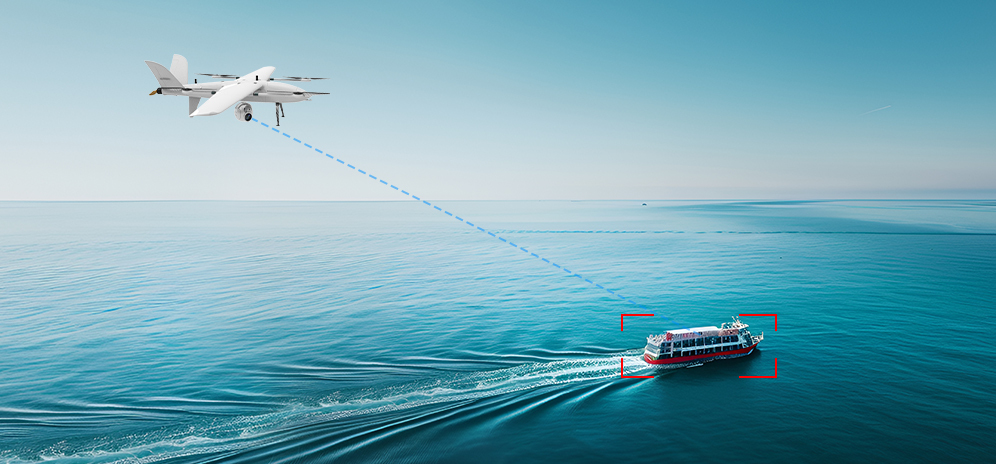 A surveillance VTOL can follow and monitor a stationary or moving target of interest along a routine patrol route if the onboard drone zoom camera tracks it. Additionally, the target's coordinates can be copied and shared with the command center. Once the monitoring is complete, the VTOL drone can return to its original patrol route.