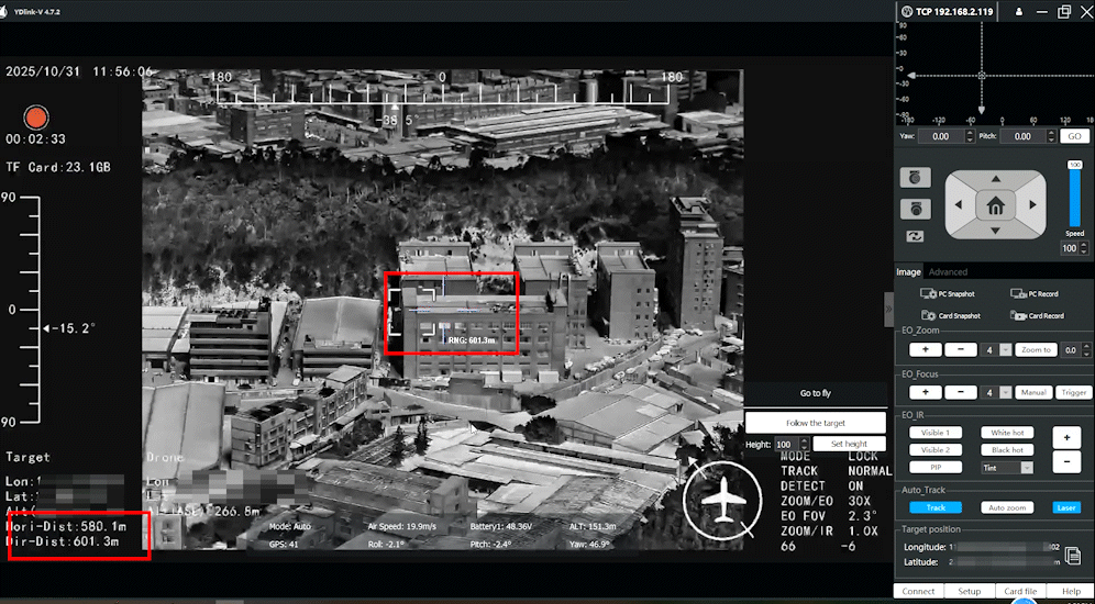 The pilot can use the LAUNCH GCS to monitor the target's movement status, such as real-time updated GPS coordinates, the distance between the target and the drone, as well as the distance between the target and the HOME position.