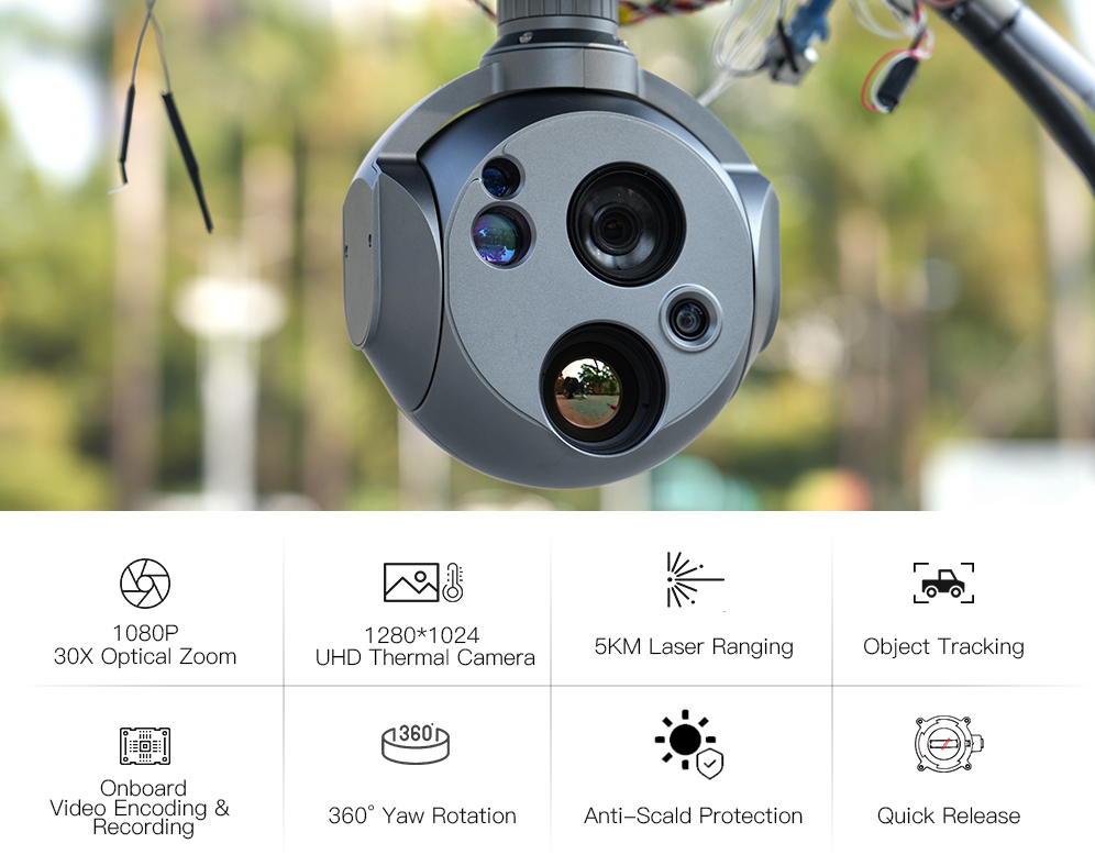 Applying the self-developed YDPORT mechanism and YDLINK software, the 30IE-MU achieves both hassle-free assembly/disassembly and intuitive operation, making drone surveillance attainable and adaptable on most drones and VTOLs.