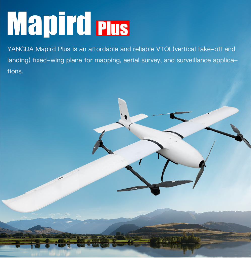 YANGDA Mapird Plus is an affordable and reliable VTOL(vertical take-off and landing) fixed-wing plane for mapping, aerial survey, and surveillance applications. It comes with four lift motors and one fixed-wing motor, which will allow the VTOL drone to ascend like a helicopter. For the mapping or security mission, the fixed-wing motor will make the drone fly like a plane.
