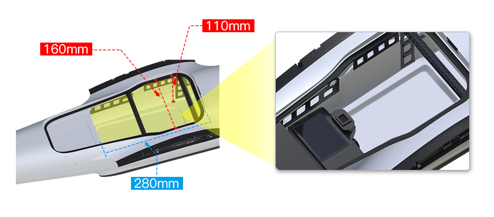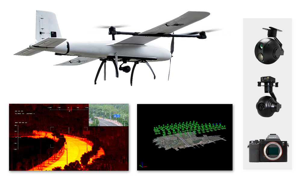 The mapping UAV has a big internal space to accommodate various mapping cameras like SONY RX1R-II/A7R/A6000/A5100 camera and oblique camera.