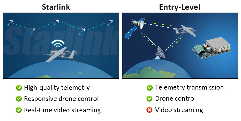 YANGDA supports two satellite communication options: entry-level and Starlink. Entry-level SatCom provides basic telemetry and drone control, while Starlink enables full communication—accurate telemetry, responsive control, and real-time video streaming, enabling uninterrupted missions even in remote or disconnected areas.