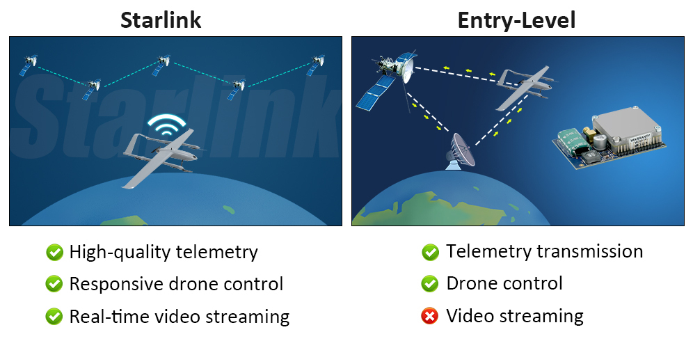 YANGDA supports two satellite communication options: entry-level and Starlink. Entry-level SatCom provides basic telemetry and drone control, while Starlink enables full communication—accurate telemetry, responsive control, and real-time video streaming, enabling uninterrupted missions even in remote or disconnected areas.