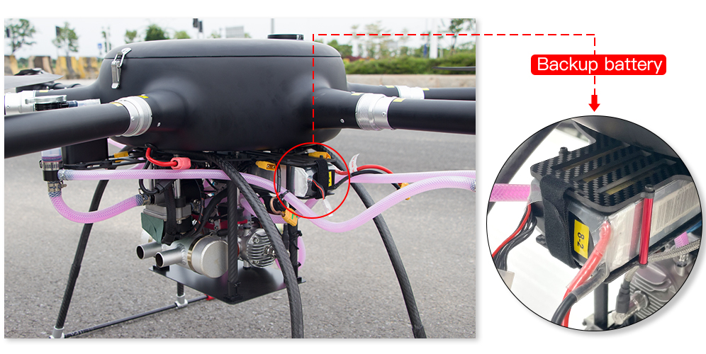 YD6-1600L hybrid drone provides 2 units 6S lipo batteries for 90 seconds emergency landing, just in case the gasoline-electric engine fails during the flight.